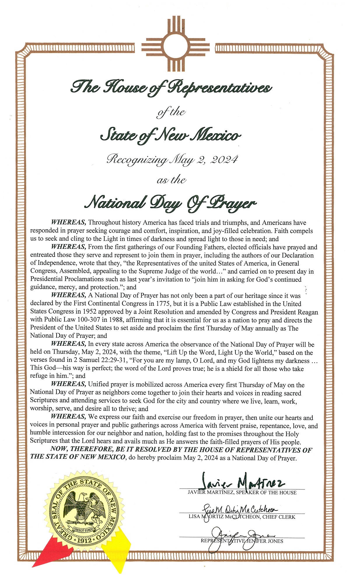 National Day of Prayer 2024 acknowledgement from NM Legislature